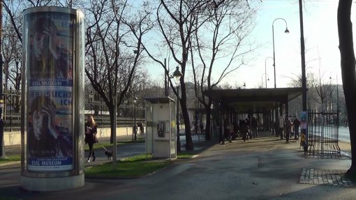One of the typical Viennese Litfass columns along Ringstrasse (Columns with announcements inside. Rotating core, illuminated by night). This is the same column as in clip no. 12200, but excentric on the left side of the frame.