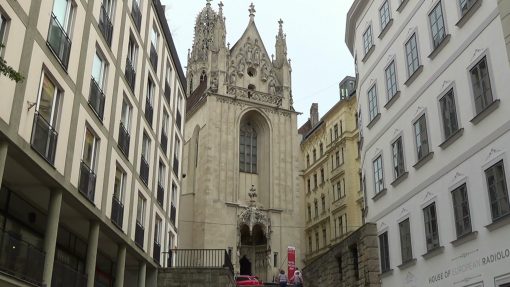 The church “Maria am Gestade” in the old town. The fountain and statue “Hannakenbrunnen” stands invisible on the left side of the camera. This is a tilt up the stairway. The old town of Vienna is UNESCO World Cultural Heritage Site.