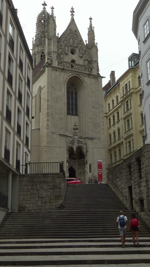 The church “Maria am Gestade” in the old town, seen from Concordiaplatz. The old town of Vienna is UNESCO World Cultural Heritage Site.