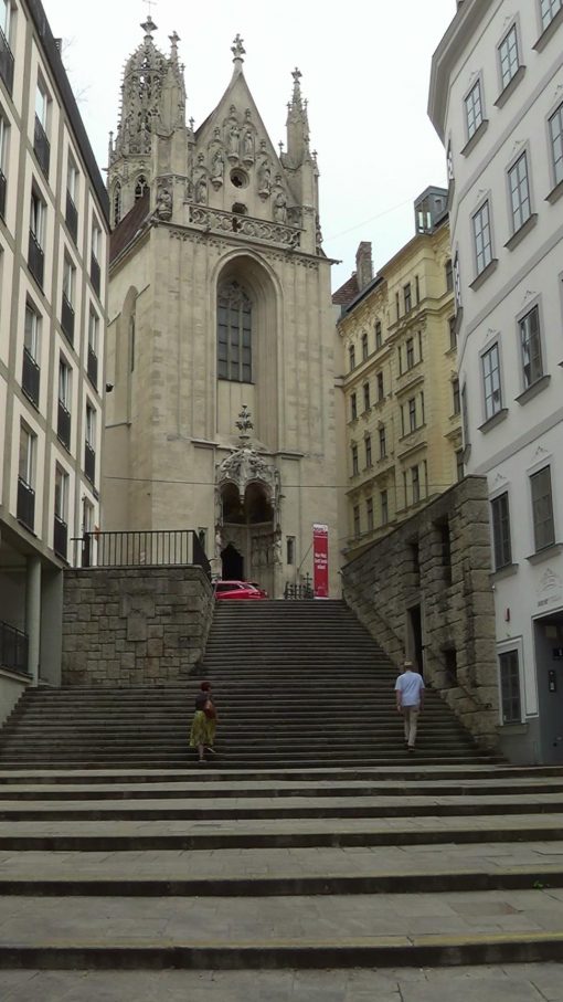 The church “Maria am Gestade” in the old town, seen from Concordiaplatz. The old town of Vienna is UNESCO World Cultural Heritage Site.