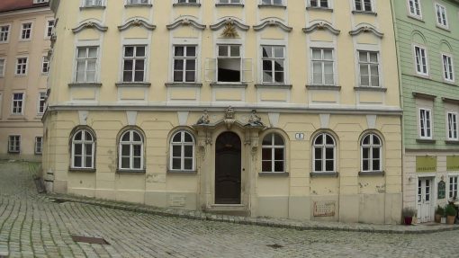 Innere Stadt, the house Schreyvogelgasse no.8 on Mölkerbastei (Mölker Bastion). This is a zoom out. The house had a comprehensive renovation in 2017. The Innere Stadt (Old Town) of Vienna is UNESCO World Cultural Heritage Site.
