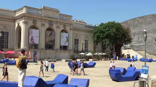 The inner courtyard of Museumsquartier (Museums Quarter). Once court stables, then exhibition halls, since 2001 a unique museum complex. The structured dark facade to the right is the Museum of Modern Arts (mumok) – its counterpiece, the white Leopold Museum block, stands invisible, out of the frame, on the left hand side.