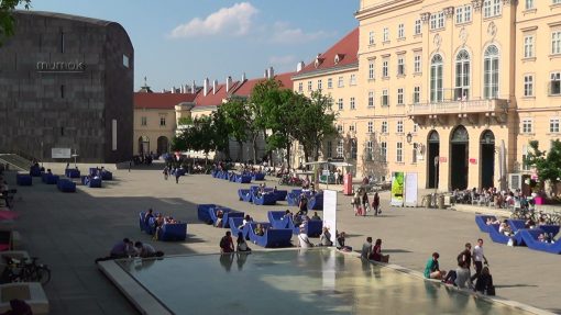 The inner courtyard of Museumsquartier (Museums Quarter). Once court stables, then exhibition halls, since 2001 a unique museum complex. The dark building far left is the Museum of Modern Arts Stiftung Ludwig “mumok”. Its counterpiece, the white Leopold Museum block, is behind the camera.