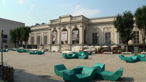 The inner courtyard of Museumsquartier (Museums Quarter). Once court stables, then exhibition halls, since 2001 a unique museum complex. The white block far left is the Leopold Museum – its counterpiece, the dark building at the end of the panorama, is the Museum of Modern Arts Stiftung Ludwig (mumok).