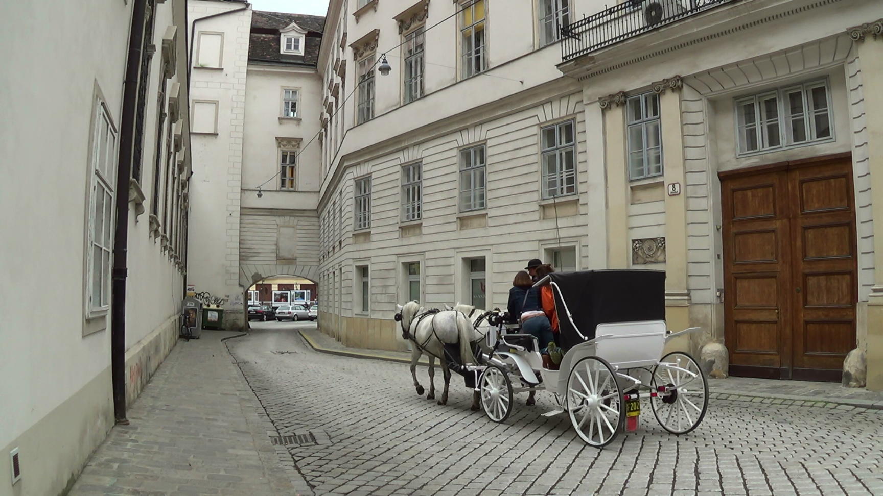 In the narrow Schulhof lane. A fiacre (a horse drawn carriage) passes, the hoofs clatter loud on the granite pavement.