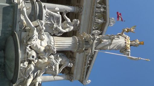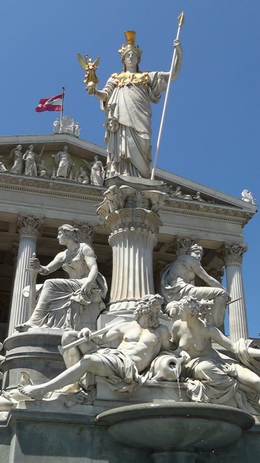 In front of the Parliament Building (Parlament) at the Ring Alley, next to the Town Hall (Rathaus). Pallas Athene, the greek goddess of justice, stands in front of it. UNESCO World Cultural Heritage Site.