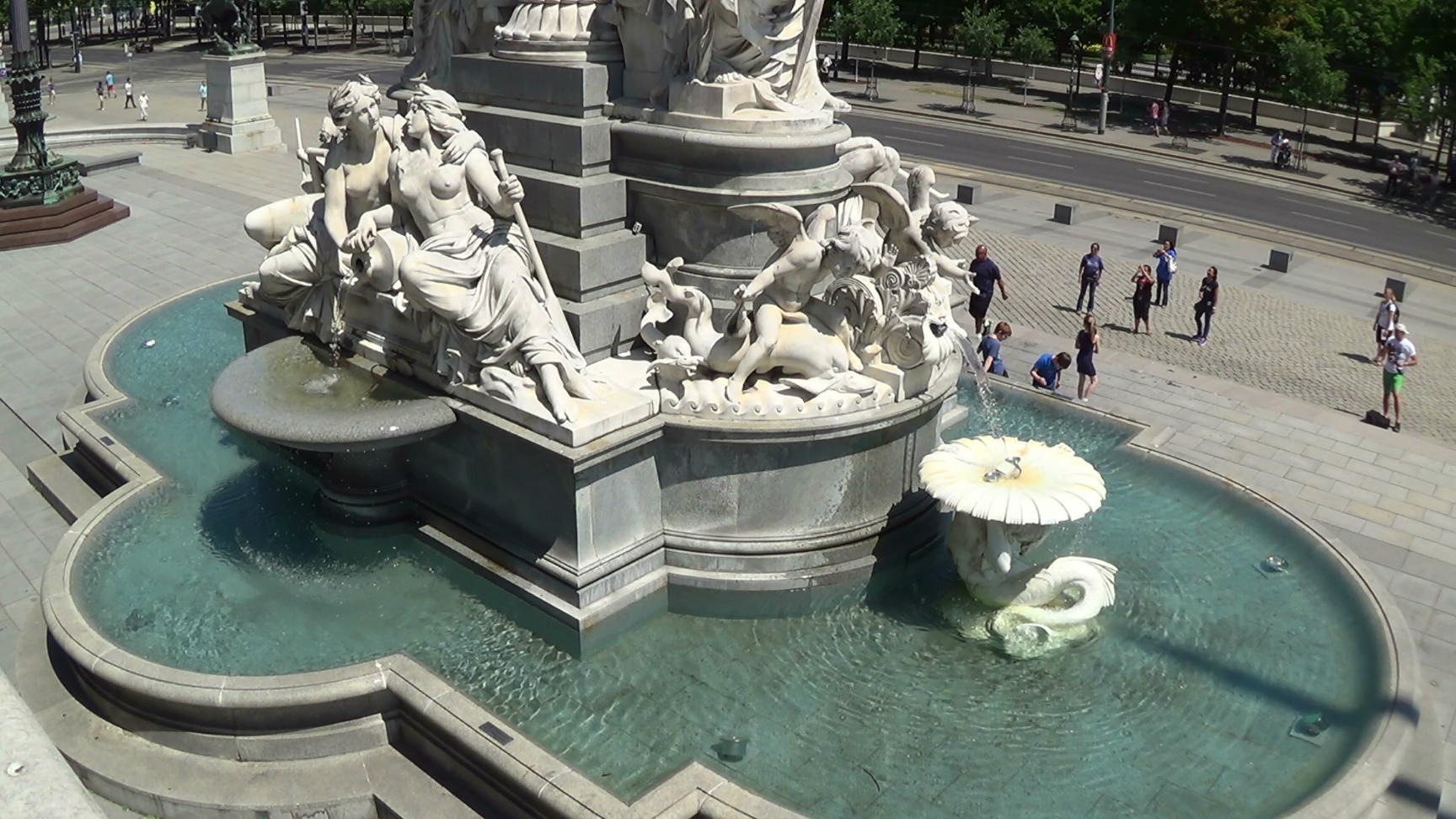 On Ring Street, at the Parliament Building (Parlament). Pallas Athene, the greek goddess of justice, stands in front of the building, on top of a fountain. This is the fountain, seen from the ramp to the parliament building.