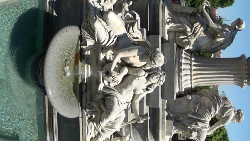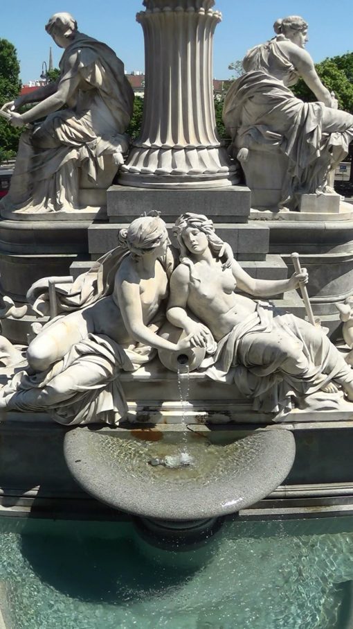 In front of the Parliament Building (Parlament) at the Ring Alley, next to the Town Hall (Rathaus). Pallas Athene, the goddess of justice, stands in front of the building, a fountain installation below her.