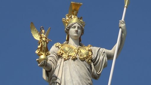At the Parliament Building (Parlament) at the Ring Alley, next to the Town Hall (Rathaus). Pallas Athene, the greek goddess of justice, stands in front of it.