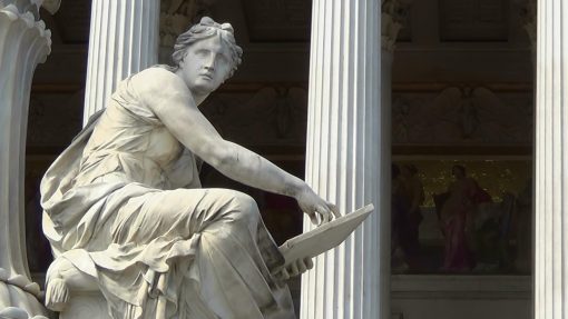 The Parliament Building (Parlament) at the Ring Alley, next to the Town Hall (Rathaus). Pallas Athene, the goddess of justice, stands in front of the building on a column, surrounded by several figures. This female figure with the tablets of the law in hands stands for the legislative power (The second figure on the other side of the column, a woman with a sword, stands for the executive power).