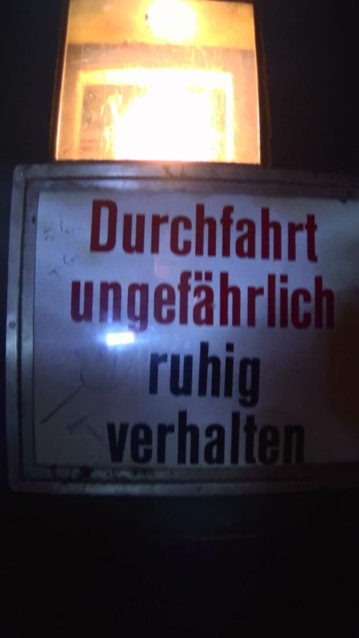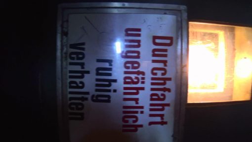 In one of the last Paternoster elevators. This is the upper turn of the cabin. Dark in parts.