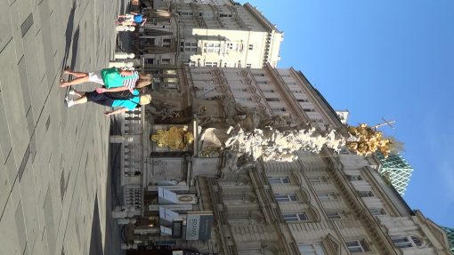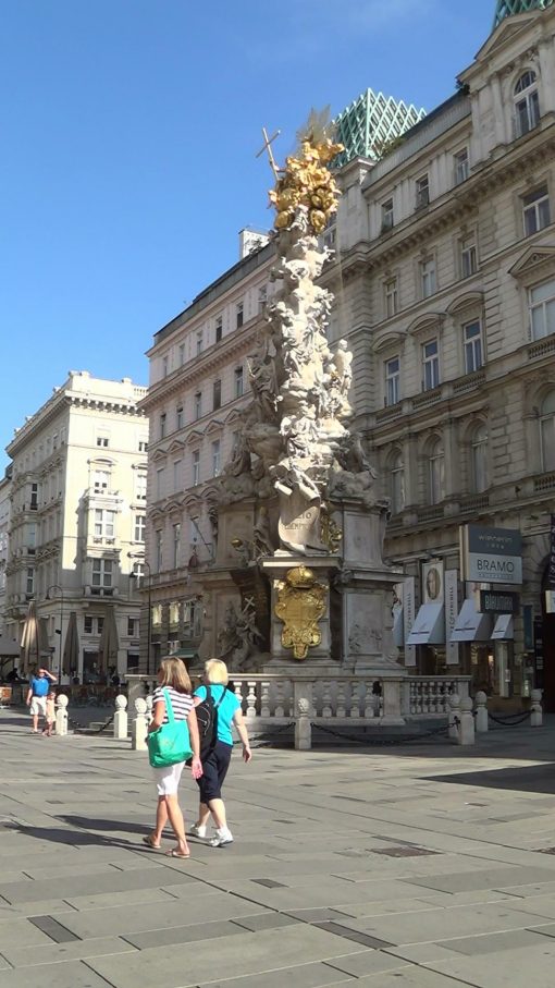 Innere Stadt (Old Town), Graben, the Plague Column. The Old Town of Vienna is UNESCO World Cultural Heritage Site. On this video, the column is less in the sunlight (hence darker) than in the video clip no. 84752.