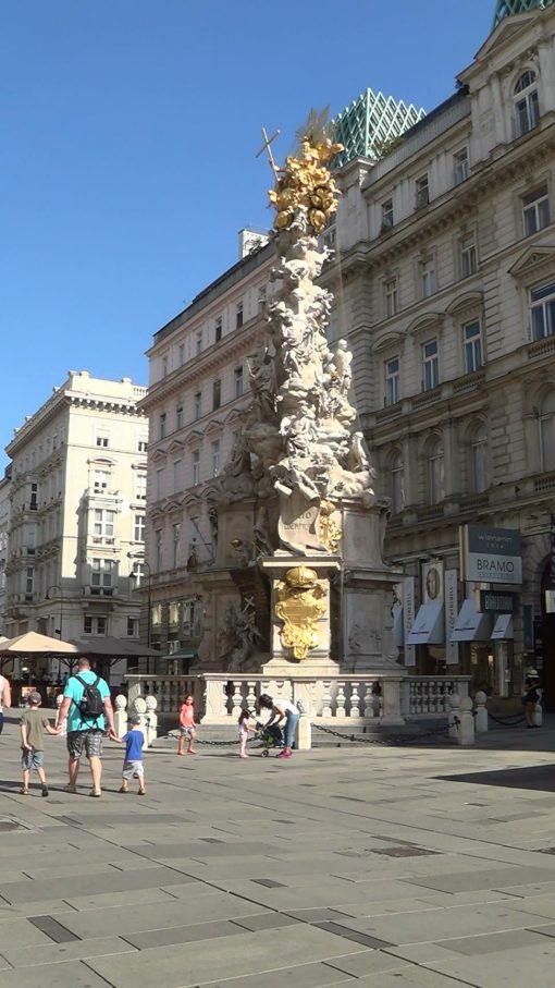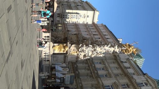 Innere Stadt (Old Town), Graben, the Plague Column. The Old Town of Vienna is UNESCO World Cultural Heritage Site. On this video, the column is more in the direct sunlight (hence lighter) than in the video clip no. 83718.