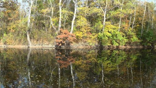 Indian summer in the Wiener Prater Forests. Slowly floating leaves on the water.