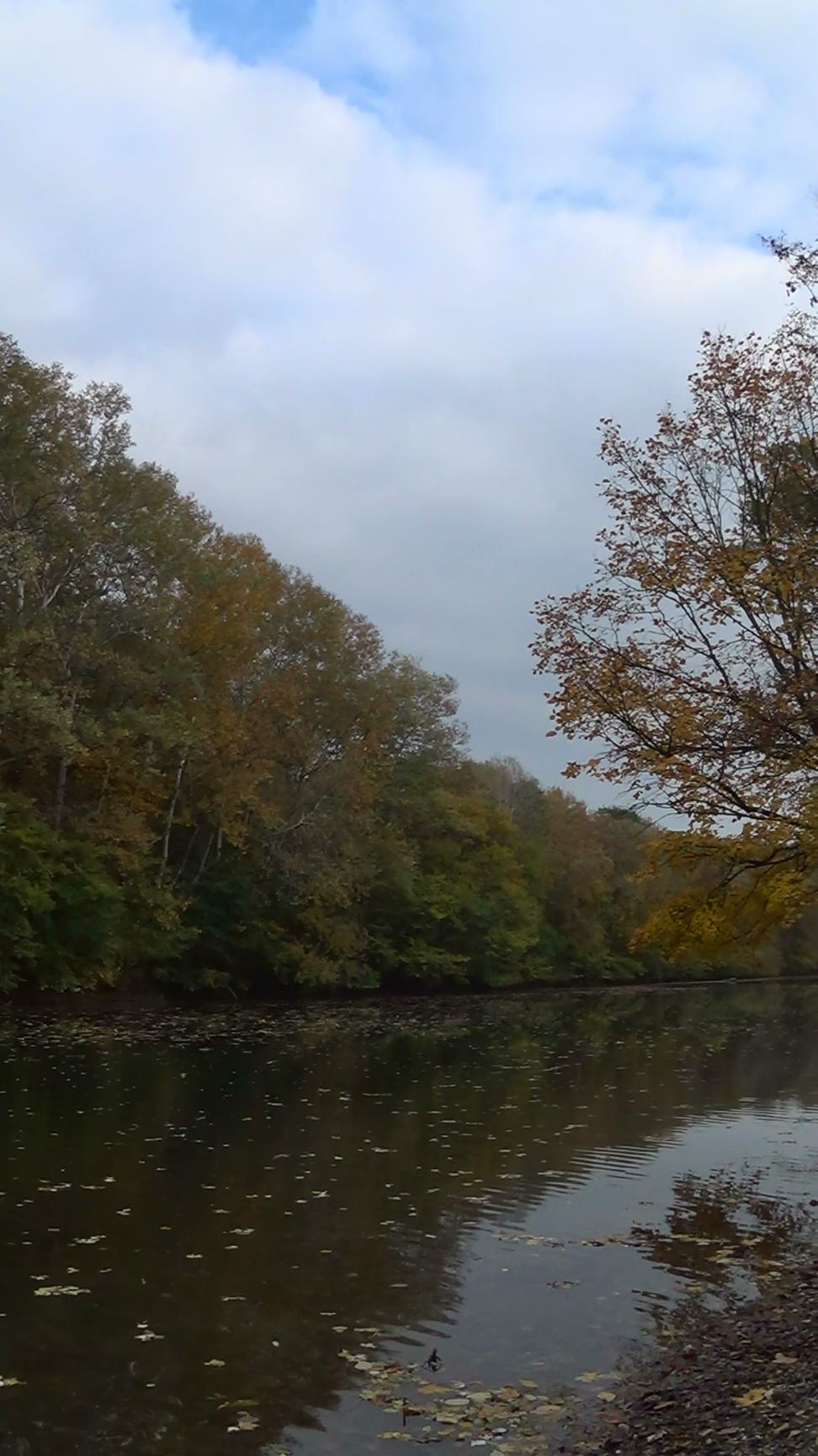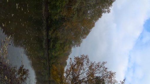 Indian summer in the Wiener Prater Forests. Slowly floating leaves on the water. Panorama from the left to the right.