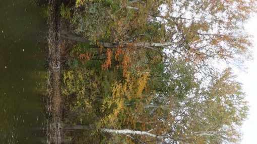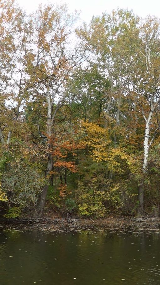 Indian summer in the Wiener Prater Forests. Slowly floating leaves on the water. Panorama from the right to the left.
