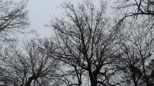 Vienna, Austria. Crows in the naked Prater trees. Many birds, rather quiet.