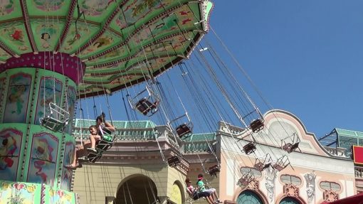 Wurstelprater, the amusement park in the Wiener Prater area. On a warm summer morning, the first passengers warm up on the merry-go-round.