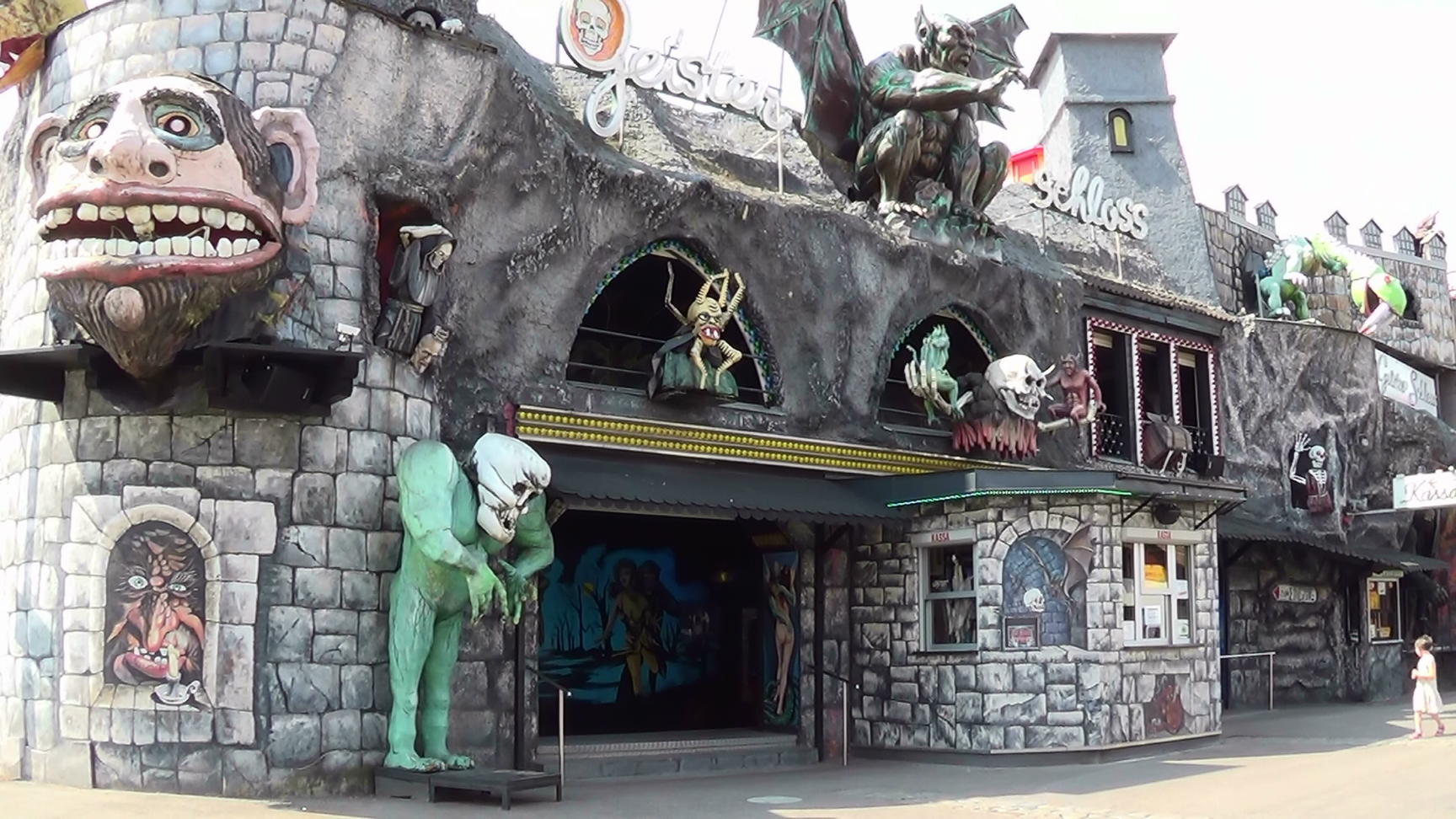 Wurstelprater, the amusement park in the Wiener Prater area. On a warm summer morning, the ghost train still sleeps. This take is closer to the object than the video clip no. 04406.