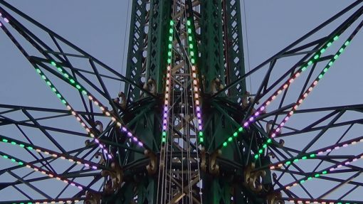 Wurstelprater, the amusement park in the Wiener Prater. The bogie on the tallest merry-go-round ascends.