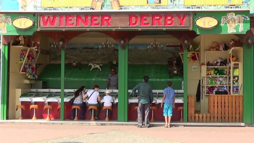 Wurstelprater, the amusement park in the Wiener Prater area. On a warm summer morning, the first visitors try the “Wiener Derby” horse race.