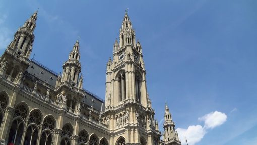 Roof and towers of the Rathaus (Town Hall). This is a panorama from the left to the right. UNESCO World Cultural Heritage Site.