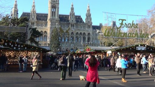 Christkindlmarkt, the traditional christmas market on Rathausplatz, the square in front of the Rathaus (Town Hall). This is a view from Ringstraße (Ring Street) into the hut scenery, with Rathaus in the background.