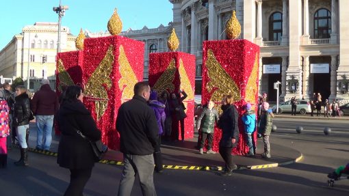 Christmas market on Rathausplatz, the square in front of the Rathaus (Town Hall). This is the entrance area, with the Burgtheater in the background.