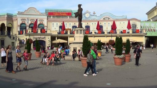 Riesenradplatz (Giant Ferris Wheel Square) in the Wurstelprater (the Prater amusement park). This is the main gate, seen from the inside. The Riesenrad (Giant Ferris Wheel) is behind the camera.