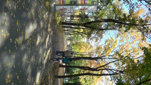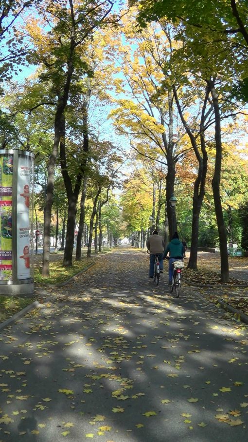 In the alley of Ring Street (Ringstraße), the street that encircles the old town. Cyclists pass. Autumn leaves.