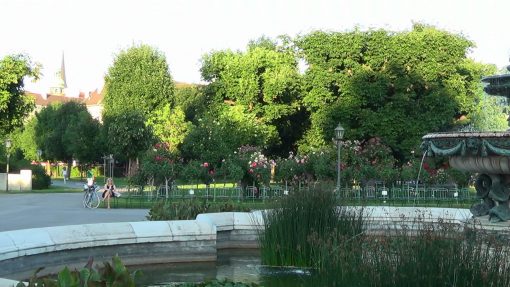 Volksgarten, in the Rosengarten (Rose Garden) section. This is a panorama from the right to the left. The Old Town of Vienna is UNESCO World Cultural Heritage Site.