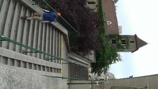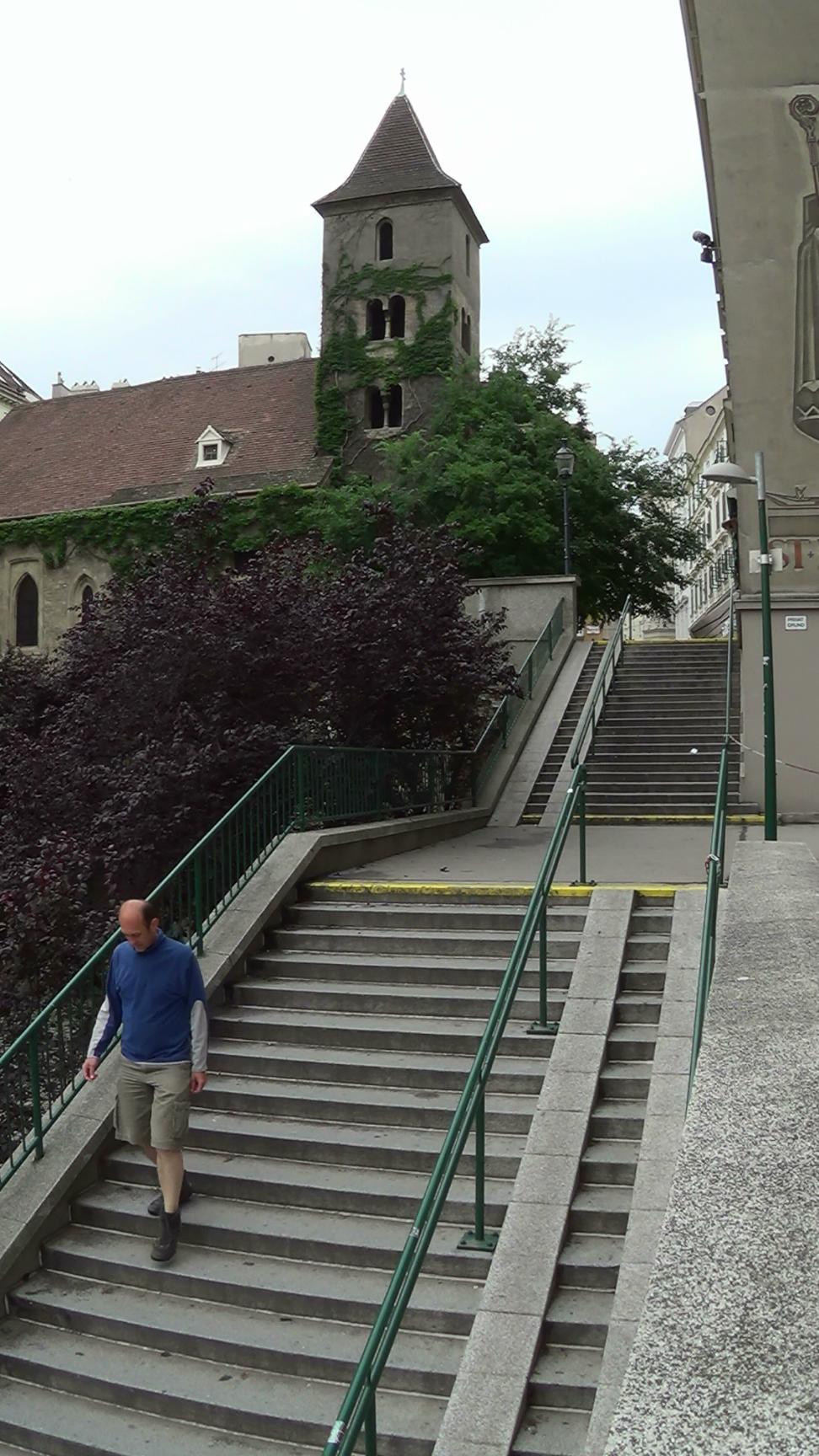 Holly Martins (Joseph Cotten) and Anna flee the mob over this stairway (better: the post-war ruins of the stairway), after the concierge Karl (Paul Hörbiger) has been found dead in the cinema movie “The Third Man“, 1949. Visit the Third Man Museum in Vienna.