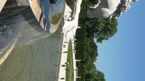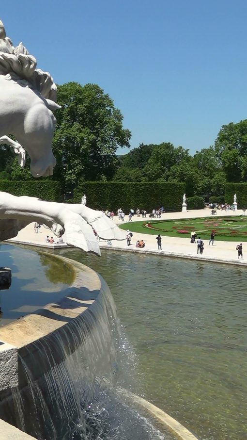 At Neptune Fountain (Neptunbrunnen), the main element in the “Great Parterre”, located right between the palace and the “Gloriette” up the hill. This is a view from the fountain balustrade to the garden “Great Parterre”.