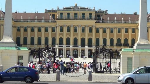 Main entrance, frontyard “Ehrenhof” (Court of Honour) and street front of Schönbrunn Palace. This is a zoom out. Schönbrunn Palace is UNESCO World Cultural Heritage Site.