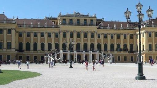In the frontyard “Ehrenhof” (Court of Honour) of the Imperial Schönbrunn Palace (Schloss Schönbrunn). A view over the square, along the palace facade. This is a panorama from the left to the right. Schönbrunn Palace is UNESCO World Cultural Heritage Site.