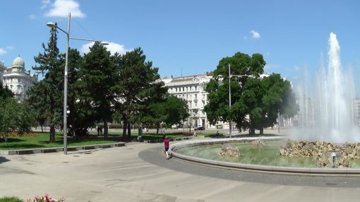 The fountain on Schwarzenbergplatz. The Russian Soldier Memorial and the Schwarzenberg Palais (Hotel and Congress Complex) are located behind the camera. This is a panorama from the right to the left.