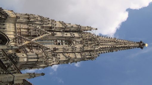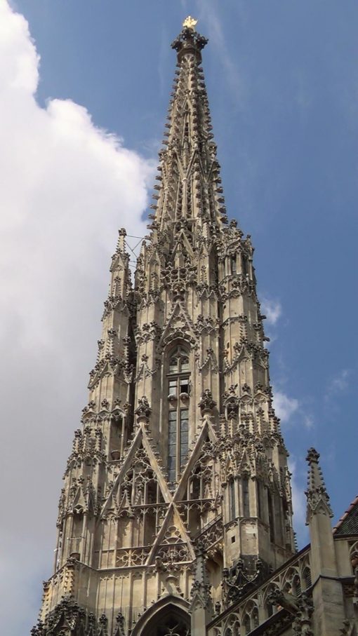 The tower of St. Stephens Cathedral in the Innere Stadt (Old Town). UNESCO World Cultural Heritage Site. The cloud speed is slightly accelerated.