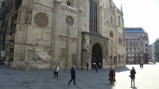 On St. Stephen’s Square in the Innere Stadt (Old Town), at the main gate (Riesentor) of the cathedral. UNESCO World Cultural Heritage Site. Few people, stores and offices are closed. This take was recorded in the weeks of Covid-19 (Corona virus) lockdown in April 2020, on an otherwise regular workday.