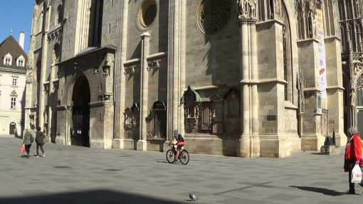 On St. Stephen’s Square in the Innere Stadt (Old Town), at the main gate (Riesentor) of the cathedral. UNESCO World Cultural Heritage Site. Few people, as offices and stores are closed. This take was recorded in the weeks of Covid-19 (Corona virus) lockdown in April 2020, on an otherwise regular workday.