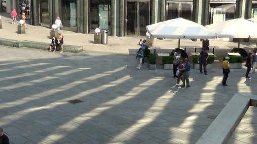 Morning scene on the square in front of the St. Stephens Cathedral. The dark/light strips on the pavement are sun reflections by a glass facade. The first tourists arrive. The Innere Stadt of Vienna is UNESCO World Cultural Heritage Site.