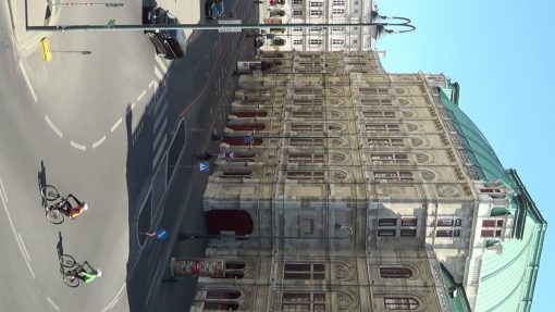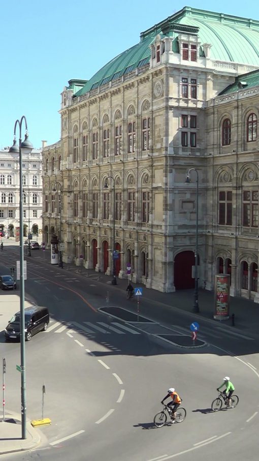 Staatsoper (State Opera House), seen from the Albertina Terrace. The Innere Stadt (old town) of Vienna is UNESCO World Cultural Heritage Site. This take was recorded in the weeks of Covid-19 (Corona virus) lockdown in April 2020, on an otherwise regular workday. Few people, almost no car traffic.