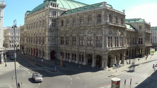 Staatsoper (State Opera House) and Hotel Sacher, seen from the Albertina Terrace. The Innere Stadt (old town) of Vienna is UNESCO World Cultural Heritage Site. This take was recorded in the weeks of Covid-19 (Corona virus) lockdown in April 2020, on an otherwise regular workday. Few people, almost no car traffic.
