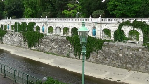 At the small Wienfluss (Wien River) that crosses the city, subterranean in parts. This is a panorama from the right to the left.