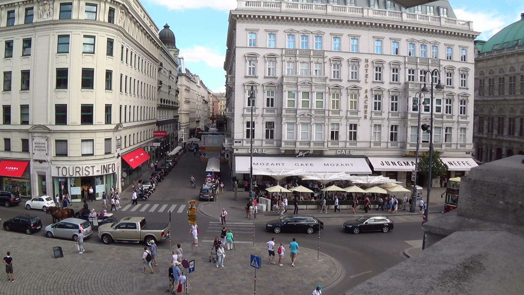 Innere Stadt, Helmut-Zilk-Platz with the “War and Fascism Memorial” (Artist Alfred Hrdlicka), seen from the Albertina Terrace. The white building housing Cafe Mozart is the Hotel Sacher, far right stands the Staatsoper (State Opera House). This is a panorama from the left to the right. The Innere Stadt (old town) of Vienna is UNESCO World Cultural Heritage Site.