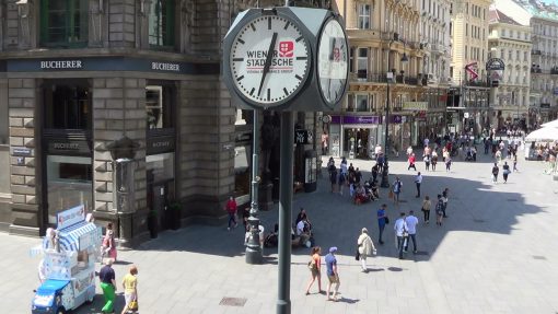 Innere Stadt (old town), Stock-Im-Eisen Platz, pedestrian zone. An old tree, full of nails, behind glass, on the wall of Palais Equitable. The story says that, in earlier times, each waltzing tradesman used to hammer a nail into the tree that once grew here. The Old Town of Vienna is UNESCO World Cultural Heritage Site.