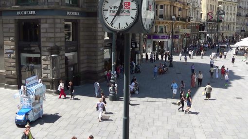 Old Town, Stock-Im-Eisen Platz, pedestrian zone. An old tree, full of nails, behind glass, on the corner of Palais Equitable. The story says that, in earlier times, each waltzing tradesman used to hammer a nail into the tree that once grew here. The Old Town of Vienna is UNESCO World Cultural Heritage Site.