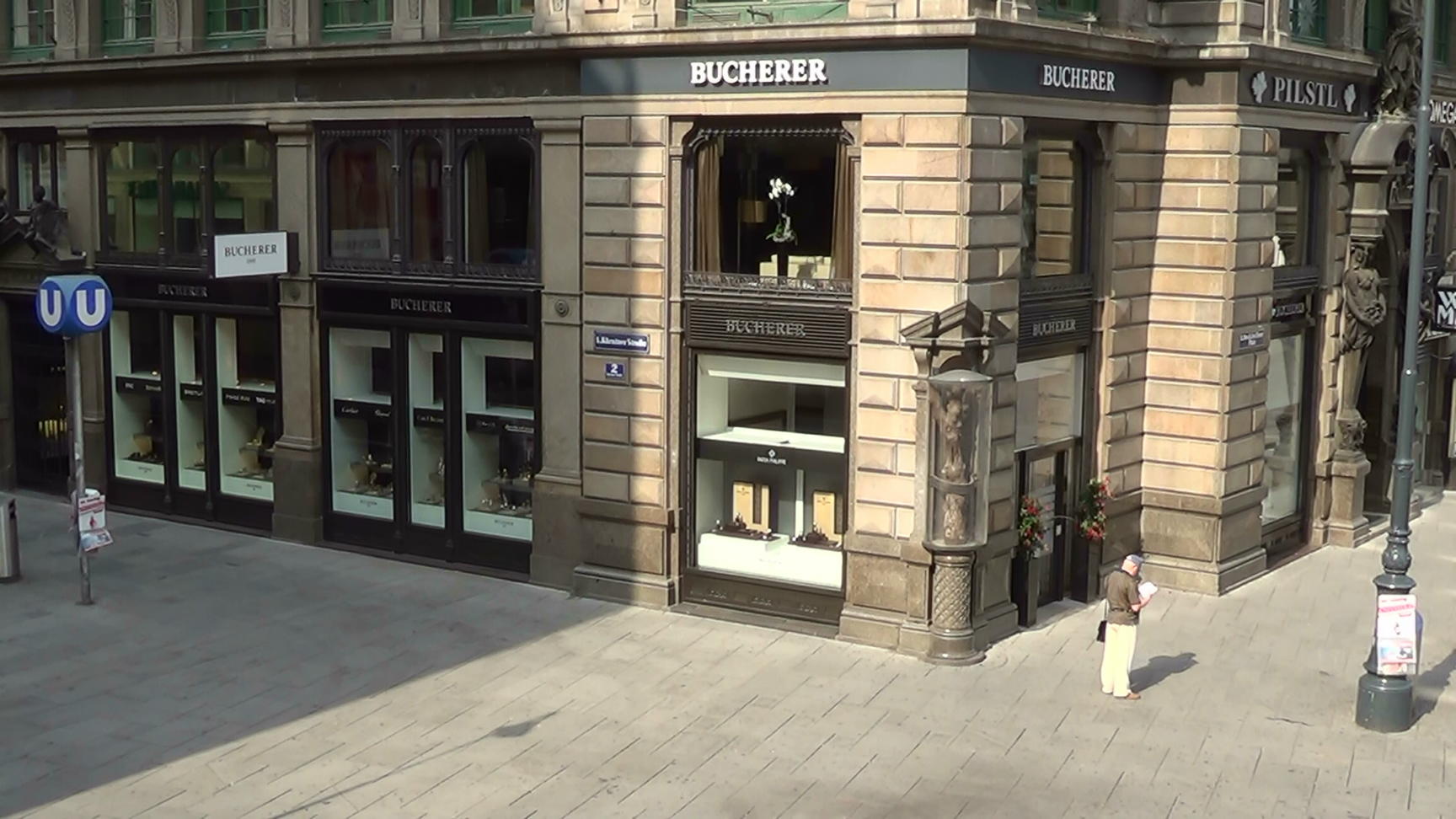 Innere Stadt, Stock-Im-Eisen Platz, pedestrian zone. An old tree, full of nails, behind glass, on the corner of Palais Equitable. The story says that, in earlier times, each waltzing tradesman hit a nail into a tree that stood here. Nice bellsound. The old town of Vienna is UNESCO World Cultural Heritage Site.