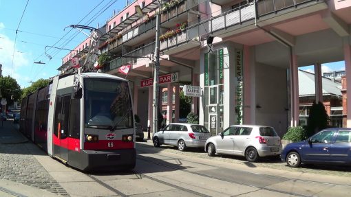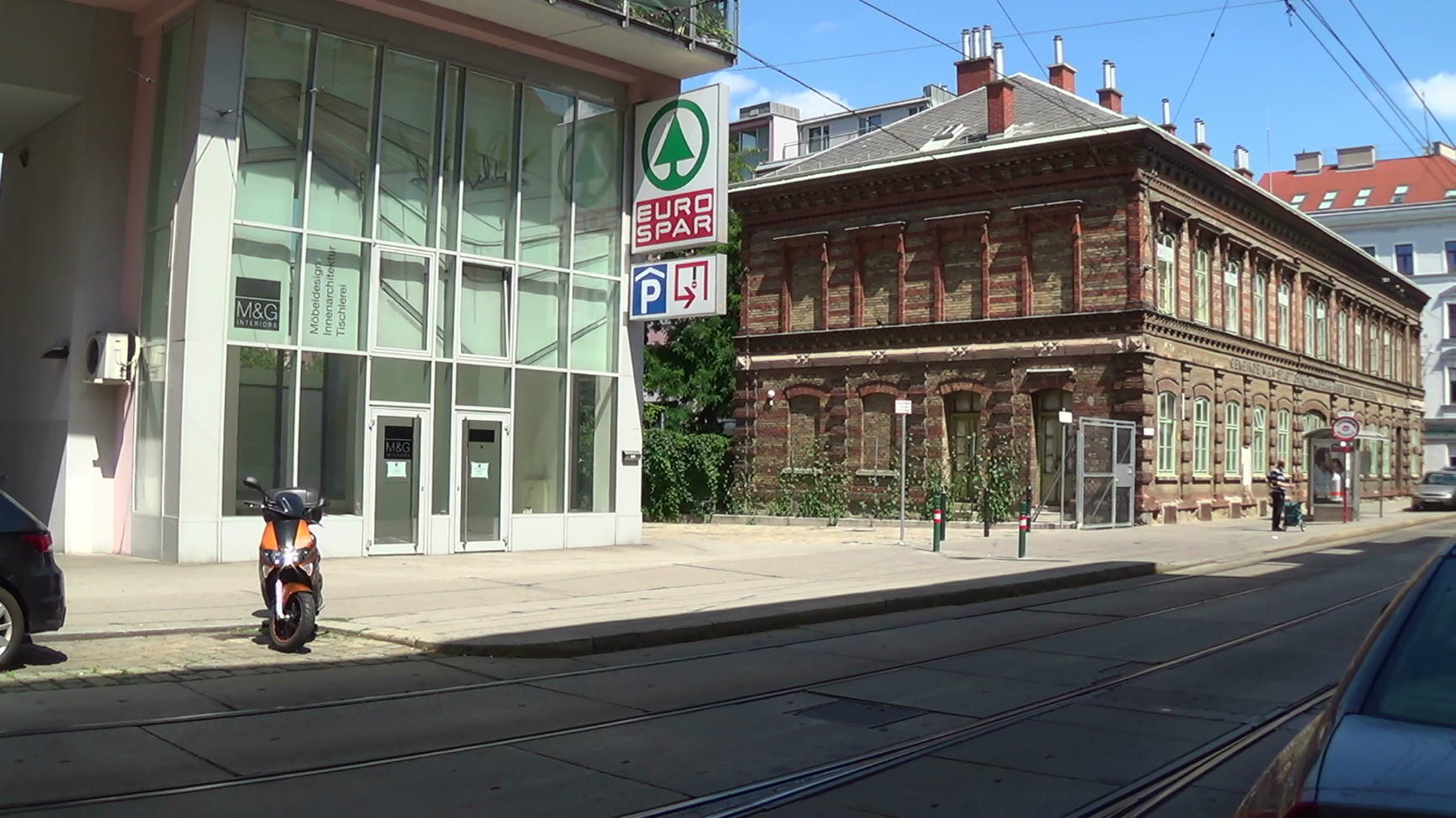 Kreuzgasse in the 18th district. A movie location for the 007 James Bond cinema movie “The Living Daylights“. This is a panorama from the left to the right. The streetcar line no. 9 really exists. The depot holds a supermarket today, on the formerly free space between the camera position and the depot (where Bond gets off the car, the chello in hands) stands a new apartment block. Far right, at the end of the panorama, is the side wing where the two wooden doors at the corner lead to ladies/gents public toilets (in the movie).