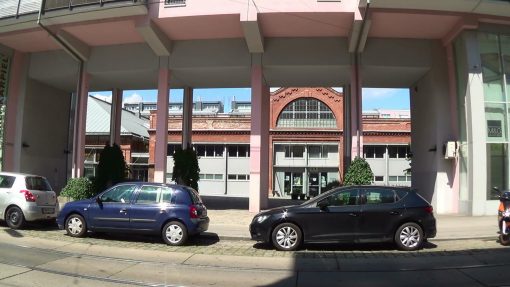 Kreuzgasse in the 18th district. This place was movie location for the 007 James Bond cinema movie “The Living Daylights“. Panorama from the left to the right. The streetcar line no. 9 really exists. The depot holds a supermarket today, on the formerly free space between the camera position and the depot (where Bond gets off the car, the chello in hands) stands a new apartment block. Far right, at the end of the panorama, is the side wing where the two wooden doors at the corner lead to ladies/gents public toilets (in the movie).