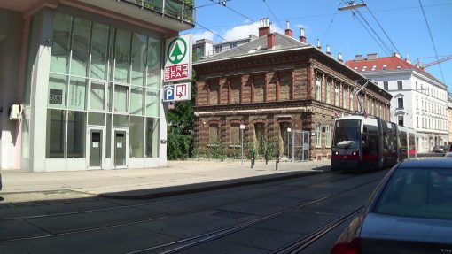 Kreuzgasse in the 18th district. This place was movie location for the 007 James Bond cinema movie “The Living Daylights“. The streetcar line no. 9 really exists. The former depot (brick facade) holds a supermarket today, on the formerly free space between the camera position and the depot (where Bond gets off the car, the chello in hands) stands a new apartment block. This here is the side wing where the two wooden doors at the corner lead to ladies/gents public toilets (in the movie).